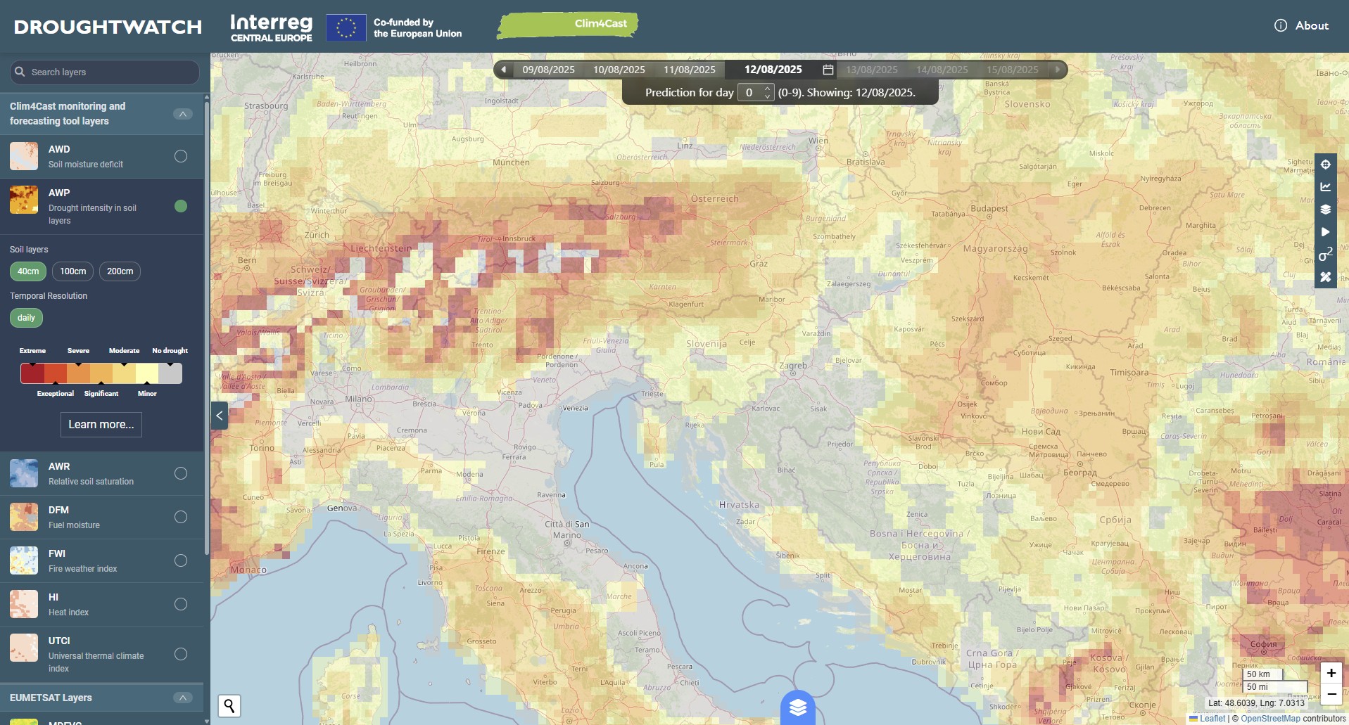 In addition to displaying past and current conditions, the application uses weather forecasts to provide an outlook of expected drought development for a little over a week ahead. The attached images show forecasts for the period from 15 to 21 August. In Slovenia, drought is not expected to be as severe as during the first wave this year, while in the Balkans the situation is projected to worsen further.